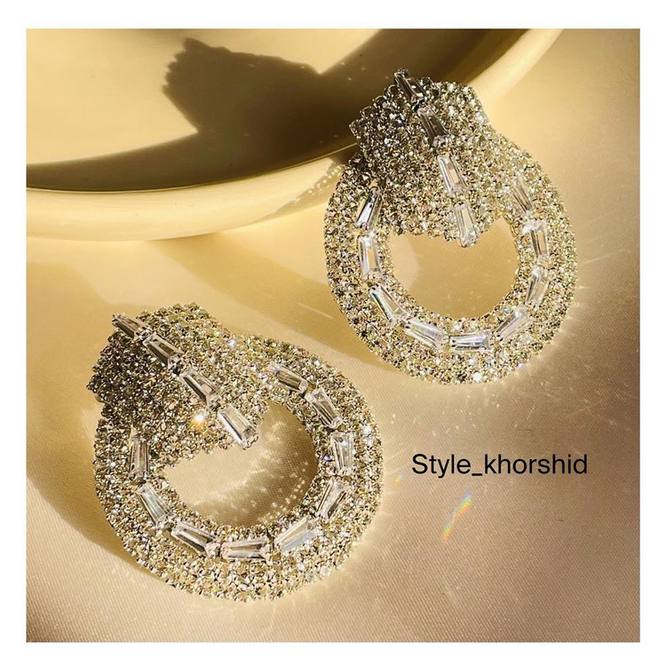 گوشواره مجلسی نگین اتریشی مخراج کاری . پایه کار نقره ای . رنگ نگین سفید